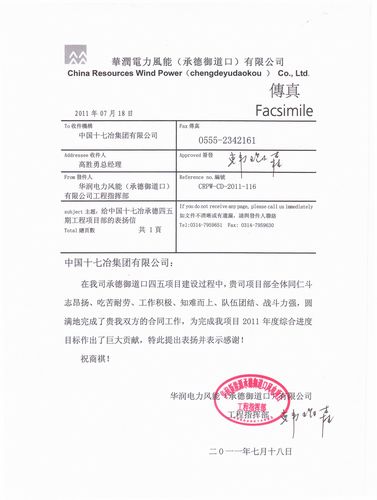 日前,风力与太阳能发电工程技术公司收到华润电力风能(承德御道口)有限公司工程指挥部的表扬信。信中对我公司承德御道口四、五期项目全体人员工程在建设过程中表现出来的斗志昂扬、吃苦耐劳、工作积极、迎难而上、队伍团结、战斗力强的精神给予了高度称赞,对我公司圆满完成施工任务表示感谢。