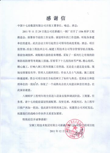自新疆八一钢铁150T转炉工程进入冬期施工以来,两级公司领导非常重视工程进展情况,并指派专人驻守现场。项目部更是未雨绸缪,超前谋划,精心组织,各级管理人员坚持在现场指挥协调,作业人员士气高涨,工程进展快速向前推进,且质量和安全受控,受到了业主、监理和总包方的一致好评。