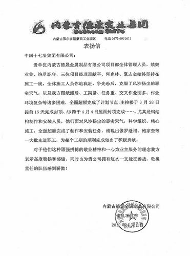 在工程建设中,十七冶内蒙古德晟金属制品公司项目部三位负责人邢献平、何克林、夏治金带领全体员工充分发扬“高效严谨、精细务实”的企业作风,科学组织,精心施工,恪尽职守,努力克服工期紧、任务重、冬季超低温、风沙扬尘等种种困难,各子项均全面超前完成,有力地推动了整个工程建设。对此,内蒙古德晟实业集团特发来表扬信,对项目施工中,广大员工想业主之所想、急业主之所急的顽强拼搏和敬业精神给予了高度评价。