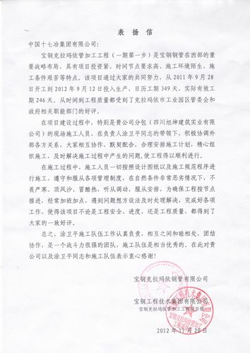 日前,宝钢克拉玛依钢管有限公司、宝钢工程技术集团有限公司克拉玛依管加工工程项目组联名致信中国十七冶集团,表扬十七冶新疆分公司克拉玛依管加工工程项目经理部在施工中克服各种困难,优质高效地完成施工任务,并对此表示衷心的感谢。