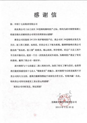 继我公司承建的芜湖新兴铸管2#120吨转炉顺利投产以来,3#连铸机安装显得尤为重要,业主方极为关注。该工程工期紧、标准高,冶金工程技术公司上下极为重视,积极响应芜湖新兴铸管有限责任公司提出的“重品质,提工期”的要求,精心组织,科学管理,经过广大员工两个半月的辛勤付出,提前一个月一次性热负荷试车成功,为该工程顺利投产奠定了坚实的基础,赢得了业主好评。