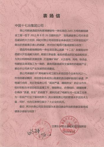 日前,酒钢集团东兴铝业嘉峪关项目指挥部向中国十七冶集团发来表扬信,对甘肃分公司酒钢东兴铝业项目部全体参战员工对该项目一区顺利投产做出的贡献表示衷心的感谢。