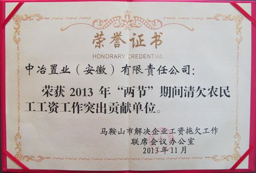 1120马鞍山市农民工工资清欠工作会议上,中冶置业(安徽)有限责任公司荣获“2013年‘两节’期间清欠农民工工资工作突出贡献单位”称号,受到大会表彰。