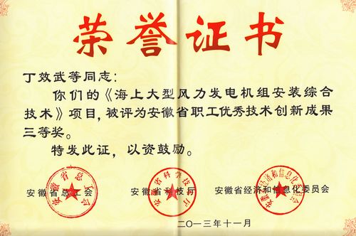 该五项技术成果分别是:丁效武等人研发的《海上大型风力发电机组安装综合技术》获得安徽省总工会、科技厅、经信委授予的“安徽省职工优秀科技创新成果三等奖”;魏鹏的《临时索道安装工法》、丁效武的《2000kw风力发电机安装工法》、陶金福的《3200m3高炉系统热风炉筑炉施工法》和倪淑梅的《地轨式索道安装工法》分别获得安徽省劳动竞赛委员会和安徽省总工会授予的“安徽省职工先进操作(工作)法”。