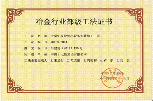获得2014年度冶金行业部级工法的有:冶金工程技术公司的《大型铝板拉伸机设备安装施工工法》、《钢筋混凝土双曲线冷却塔移置模板施工工法》和《500kA铝电解槽现场制作施工工法》,风力与太阳能发电工程技术公司的《2000kW风力发电机拆除施工工法》和《沿海滩涂太阳能光伏发电施工工法》。