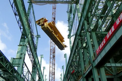 11月1日上午,湛江炼钢工程正式拉开了首台行车吊装的序幕。由广东十七冶建设有限公司承建的宝钢湛江钢铁炼钢项目的炼钢主厂房内,壹台350吨大型履带塔吊将首台起重量为500吨、跨度为21.4米,高28.6米的行车高高吊起,缓缓的、稳稳地落入行车轨道,行车吊装一次成功就位,正点安装成功。