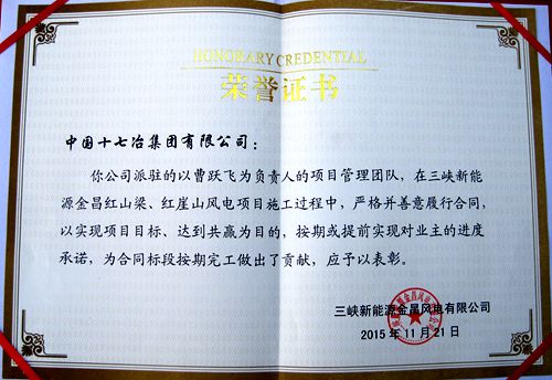 三峡新能源金昌风电有限公司感谢中国十七冶集团在三峡新能源金昌红山梁、红崖山风电项目施工过程中,严格履行合同,实现项目目标,达到共赢,提前实现对业主的进度承诺,为实现合同标段顺利完工做出的重大贡献。