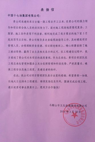 日前,马鞍山市文化旅游投资集团有限公司向中国十七冶集团发来表扬信,表扬中冶置业(安徽)公司在马鞍山采石古镇一期项目上严格管理,确保工程安全与施工进度所作出的努力。