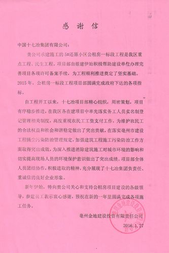 127,亳州金地建设投资有限责任公司向中国十七冶集团发来感谢信,对中国十七冶集团亳州5#还原小区公租房项目一年以来的工作表示肯定和衷心的感谢。