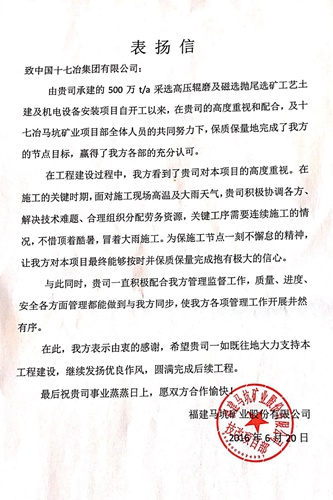 620日,福建马坑矿业股份有限公司向中国十七冶集团发来表扬信,表扬冶金工程技术公司在500t/a采选高压辊磨及磁选抛尾选矿工艺土建及机电设备安装项目建设过程中,面对各种不利因素,一刻也不放松、不懈怠的出色表现。