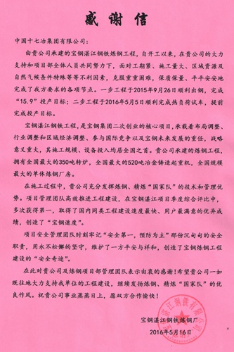 近日,宝钢湛江钢铁炼钢厂向中国十七冶集团发来感谢信,对中国十七冶集团给予湛江炼钢项目建设的大力支持表示由衷的感谢,对炼钢项目部管理团队在工程建设中做出的成绩与贡献予以充分肯定与赞许。
