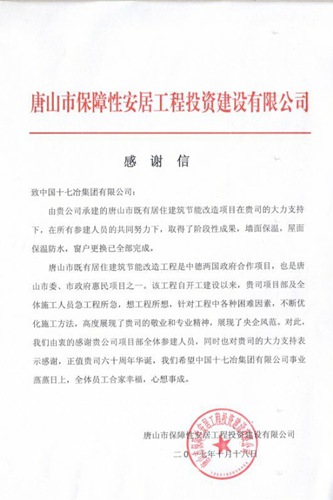 10月23日,唐山市保障性安居工程投资建设有限公司向中国十七冶集团发来表扬信,感谢十七冶为项目进展做出的努力。