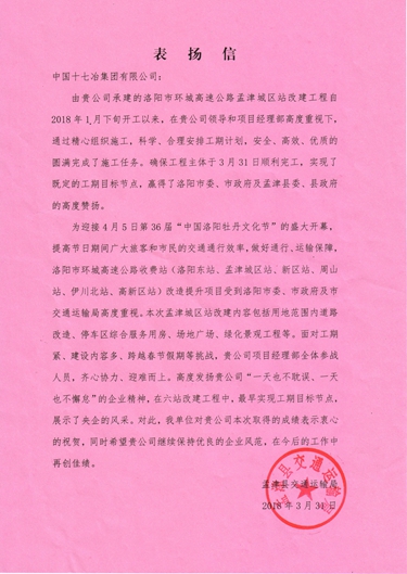 阳春四月,万物生辉。4月2日上午,河南孟津县交运局向中国十七冶集团发来表扬信,对中国十七冶集团有限公司交通工程技术分公司承建的河南洛阳市环城高速公路孟津城区站改建工程项目部安全、高效、优质圆满完成施工任务和所取得的成绩表示衷心的祝贺。