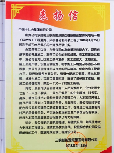 5月5日下午,中国十七冶集团收到三峡新能源绥德发电有限公司发来的表扬信,对风力与太阳能发电工程技术分公司顺利完成绥德张家峰一期50MW风电安装工程表示感谢。