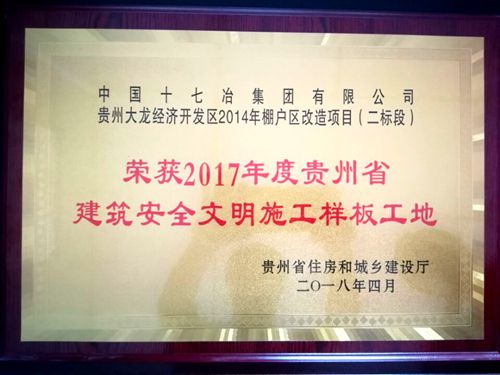 523日,由中国十七冶集团江西分公司承建的贵州大龙2014年棚户区改造项目(二标段)获“贵州省2017年度建筑安全文明施工样板工地”荣誉称号。