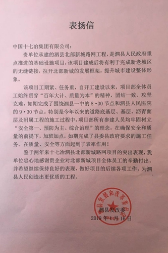 1月16日,宿州市泗县发改委向中国十七冶集团发来表扬信,表扬中国十七冶集团有限公司路桥工程技术分公司泗县北部新城路网工程(一期)项目部在工程建设中做出的突出贡献。