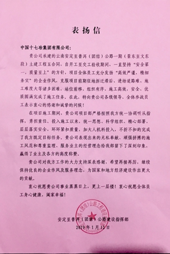 云南安普公路建设指挥部向十七冶致表扬信