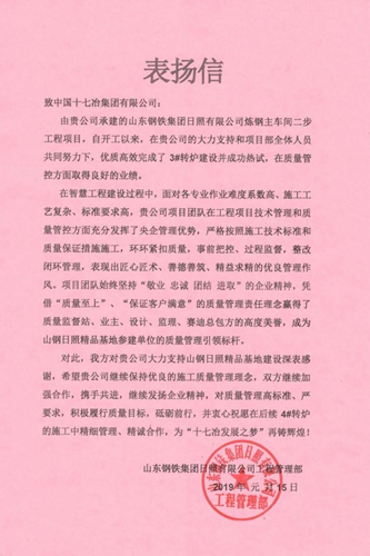 1月19日,中国十七冶集团有限公司冶金工程技术分公司收到山东钢铁集团日照有限公司发来的表扬信。