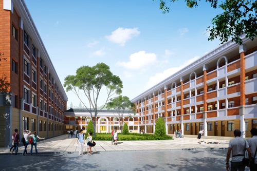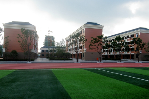 进入学校大门,映入眼帘是一条笔直宽敞的主干道,道路两侧是挺拔的杨树,如同这座学校的指引者,引导着学生们前进的方向。漫步向前,闻到一阵淡淡的花香,寻着味道的方向望去,在主干道南侧的花园里,有山茶、月季、一串红、紫荆……主干道北侧是现代化的塑胶跑道及足球场,这是给学生们上体育课、课间活动的地方,当初施工时,持续降雨,为了确保成型质量,全面采取了覆盖保护及排水措施,才得以保证工程的顺利完工。操场西边便是学校的初中部教学楼。初中部共4层,每层有6间教室,还有老师办公室、活动室。初中部的楼梯和走道都非常宽阔,四五个人并排行走也不会觉得拥挤。每间教室的外墙上都着白求恩、华罗庚、居里夫人等名人的画像。