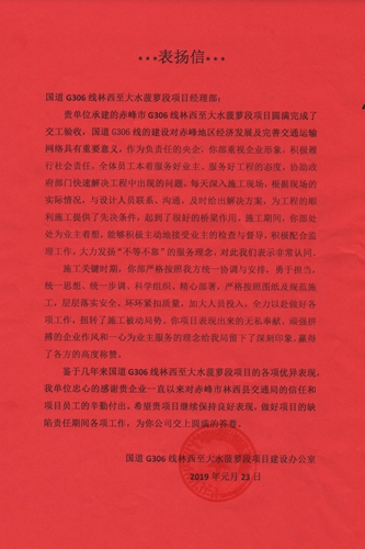 1月24日,国道306线林西至大水菠萝段项目建设办公室向中国十七冶集团有限公司发来表扬信,对路桥工程技术分公司内蒙赤峰国道306线林西至大水菠萝段项目部在工程建设中做出的突出贡献给予了表扬。
