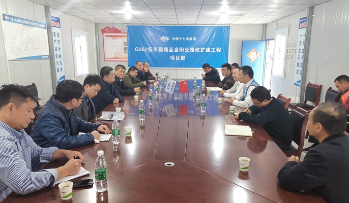 2月24日,贵州省公路局党委委员、副局长丁昭平一行到中国十七冶集团路桥技术分公司承建的G352务川藕塘至当阳公路改扩建工程项目调研。省交通运输厅安全监督处主任侯云,省公路局管理处处长葛枝槐,遵义市交通局副局长冯长林,务川县副县长田伟,县交通局副局长冷荣兴等一同参加调研。