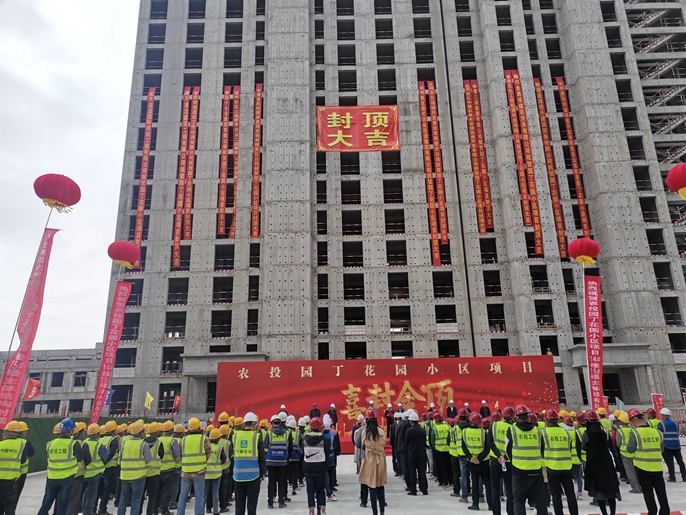农投园丁花园小区(二期)项目总建筑面积约18万平方米,包括7栋住宅楼高层(26F)、4栋商业(3-4F)、1栋幼儿园(3F)、18#酒店(6F)以及相关配套用房及其室外附属工程。此次封顶的14#楼建筑面积24040.83平米,15#楼建筑面积13042.68平方米。