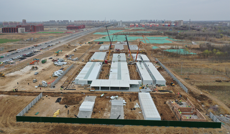 建筑分公司山东惠民县高官项目部全体工作人员加班加点,争分夺秒,连续奋战。迅速组织材料、施工人员进场,平整场地,填方48万立方米、拌合灰土16万立方米。现场投入大挖机16台,小挖机10台,吊车8台,叉车2台,平板车20台、土方车60辆。截止3月18日清晨,所有板房安装完成,板房用电安装到位,卫生洁具安装,室外工程预埋水电管完成。场地平整,准备浇筑地坪混凝土,围挡安装完成90%。