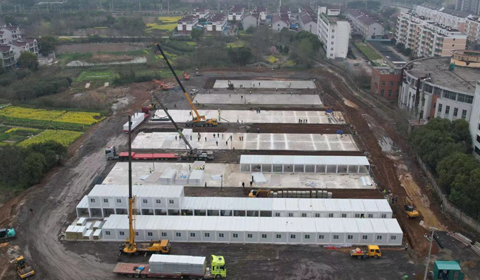房屋分公司自3月14日下午接到援建任务后,各项工作迅速有序开展。现场2小时完成第一条进场临时道路,10小时完成前期拆迁及场地平整工作,12小时驰援50套装备式箱房到达现场,18小时完成100米污水管道,48小时接通临时用水用电,55小时交付第一批42套带有独立空调卫浴的隔离房。因全国多地爆发疫情,建设过程中出现了材料紧缺的情况,为了缩短时间,现场人员因地制宜想办法,紧急定制的252套带有独立卫浴的集装箱经多方联系后最终从厂家分批发出。到18日晚22点再交付84间,剩余84间将于19日全部交付使用。