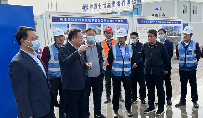 4月22日,河北省石家庄市深泽县委书记王建峰,县委副书记、县长郝英鹏到十七冶建安分公司承建的深泽县河道内村庄防洪整治项目调研。