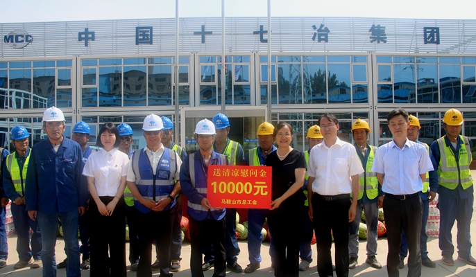 7月14日上午,马鞍山市总工会党组书记、常务副主席毛善群,四级调研员、市机械冶金化工工会主席李军,市机械冶金化工工会专职副主席郭吾敏,市总财务资产管理部部长周少峰到中国十七冶集团马钢新特钢工程项目部开展“送清凉”慰问活动。
