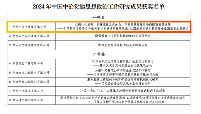 日,中国十七冶接到中国中冶文件,公司党建政研课题《六强化六提升,构建党建工作体系,以高质量党建引领保障高质量发展38项成果中脱颖而出,荣获中国中冶2024年党建思想政治工作研究成果一等奖1名,下属中冶华南申报的课题成果获评优秀奖。同时,公司作为第二课题组牵头单位荣获优秀组织奖。