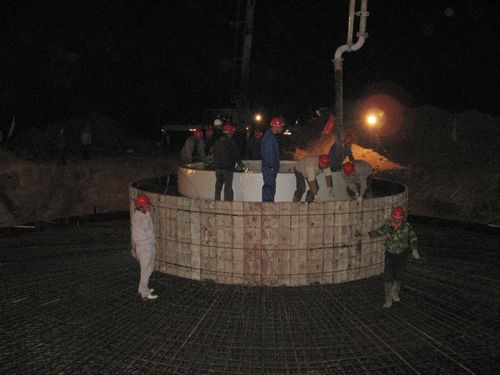 5月20日是业主要求风机基础浇注的第一个网络节点,可由于混凝土供货商服务单位多,搅拌车数量不足,白天无法作业,为了兑现对业主的承诺,项目部挑灯夜战,23号风机机位上灯火通明,机声隆隆,工地上一片繁忙景象。经过一夜的奋战,一个400m3的风机基础呈现在人们面前。业主项目负责人张守峰对此予以高度评价。