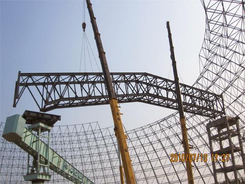 7月13日下午,水泥工程公司济宁海螺工地,两台200吨吊车在阵阵鞭炮声和人们期待的目光中将石灰石堆场罗锅桁架跨越20米高、22米长的网架,稳稳地吊运到1号转运站与中心柱顶部的活动平台上。 罗锅桁架长58.8米,重约57吨,是济宁海螺水泥厂最大的桁架。水泥工程公司凭借前期的高效施工,赢得了业主的充分信任,使得业主选择了十七冶承担该构件的制作和安装。济宁海螺项目部组织精兵强将,克服制作场地条件差、气候炎热等困难,在业主要求的时间内优质、高效地完成了制作和安装,为济宁海螺的大型设备安装创造了条件。