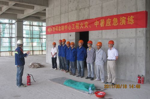 6月18日下午,城建工程技术公司蚌埠金融中心项目部在施工现场举行了一场火灾、中暑应急救援预案实战演练。 演练之前,项目部专门召开了动员会,制定详细的活动方案。演练包括“火情报警”、“逃生和财产救护”、“义务消防队员灭火”等消防安全演练和“中暑报警”、“救援队员施救”等高温中暑应急救援。演练活动进一步提高了员工的自救能力和现场应急反应能力。
