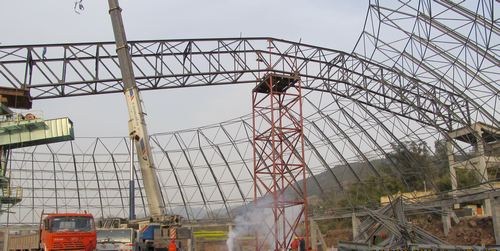 3月16日下午,由水泥工程技术公司承建的广安(台泥)4500t/d水泥熟料生产线项目石灰石堆场罗锅桁架吊装一次成功。 该桁架长58.9m,穿网架部分高20.9m,总重45t,由于桁架为拱形结构,给吊装增加了难度。项目部认真研究,最终确定了“分段制作、整体吊装、空中对接”的施工方法,采用一台200t汽车吊分二次吊装,在对接部位,将原煤输送钢支架改造成临时支架,即保证了吊装安全和质量,又节约了时间。