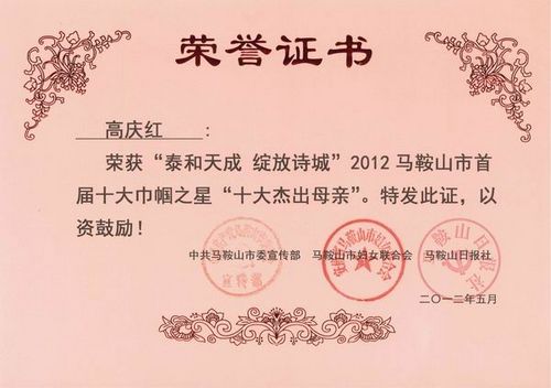 512,在马鞍山市首届“十大巾帼之星”命名大会上,路桥工程技术公司女员工高庆红荣获市妇联首届“十大杰出母亲”称号。