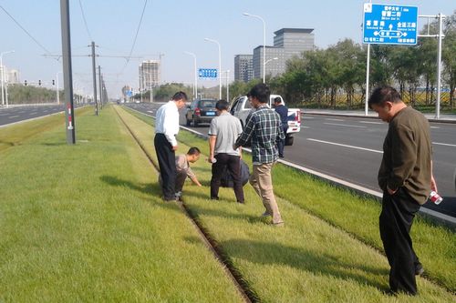 沈阳现代有轨电车1号线工程需绿化填土4.2万立方,绿化草坪植被面积达10.1万平米。项目部克服时间紧、任务重,东北地区气温偏低等诸多困难,积极创造条件,加快施工进度,从5月份开始绿化草坪铺植,于6月完成了草坪铺设。经过几个月的精心养护,草坪生长良好,后期管护细致到位,保障绿化草坪成活,为竣工验收做好了充分准备。检查组对现场、资料进行全面认真、细致的检查和验收,草坪的铺植以草质优良、铺设平整、间隙匀称受到了业主、监理及质检部门的高度评价,一次顺利通过检查组的验收。绿化草坪的铺植,使轨道掩藏在草坪中间,电车运营时就像在草坪上飞驰,成为沈阳城市交通一道亮丽的风景线。