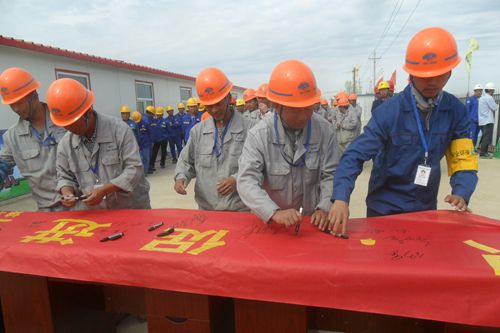 宣誓现场,大家队列整齐,以庄严的誓言,郑重承诺确保生产安全。大家面对安全月主题词,进行了庄重的宣誓,集体高诵“强化红线意识促进安全发展”的主题。为把活动推向高潮,员工们都在横幅上签上自己的名字,留下了庄重的誓言,决心抓质量、促进度、保安全,留下足迹在天山。此次宣誓承诺,旨在以“全国安全生产月”活动为契机,使作业人员及管理人员自觉将誓词铭记于心中、体现于岗位、落实于行动,提高安全责任感。