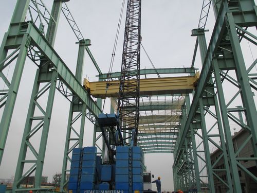 该行车位于钢包维修间厂房内,设备本体重275t,其中主梁重60t,冶金公司宝钢湛江炼钢工程项目部与参建工程处克服了施工现场遭遇台风袭击的不利影响,精心组织,设备进场后3天内完成主梁组装任务并开始吊装。第一台行车的顺利吊装,标志着宝钢湛江炼钢工程设备安装序幕的拉开,也为下一步炼钢主厂房大型行车吊装提供丰富的经验和借鉴,为后续的转炉设备就位及“15.9”节点目标的实现奠定坚实的基础。