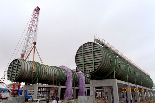 宝钢湛江海水淡化工程Ⅱ标2#海水淡化装置蒸发器是海水淡化装置的关键设备,共7效,分6段进场,长78m、直径6.8m、最大外径8.1m,总重760t。为完成节点要求,确保工期,项目部精心组织,合理安排,积极践行“高效严谨,精细务实”的企业作风和“24小时工作法”,克服蒸发器到货时间晚、施工场地狭小、设备运输摆放困难、蒸发器变形找正定位困难、双相不锈钢焊接难度大等施工困难,确保了蒸发器按节点要求顺利吊装完成。