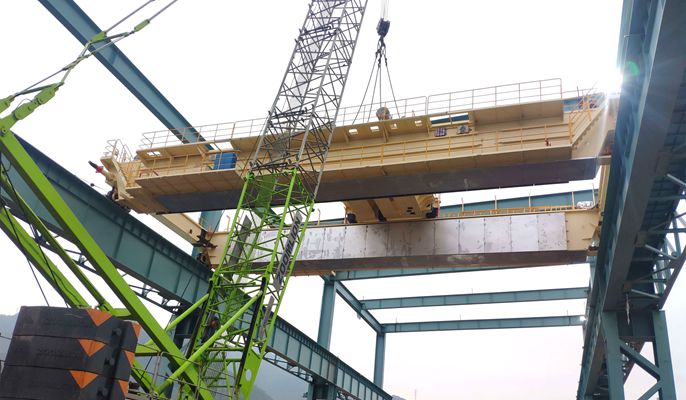 宝钢德盛新炼钢(一步)工程共有20t以上的桥式起重机共24台,最大起重量为280/80t,行车施工方案已经通过项目部内部讨论、公司专家审核、外部专家论证等多方审查。本次吊装的修罐跨行车总重量为198t,单吊最重的主小车重量为60t,利用施工现场安装钢结构的履带吊进行吊装。为保障吊装工作的安全,项目部在安装前做好充足的施工准备工作,精确计算吊装重量、要求行车安装区域走道板安装完毕、拉设安全绳、提前做好行车的各种保险支撑,并安排专人全程现场监督、指导。整个吊装过程按照原定计划顺利实施,总用时不到8小时。