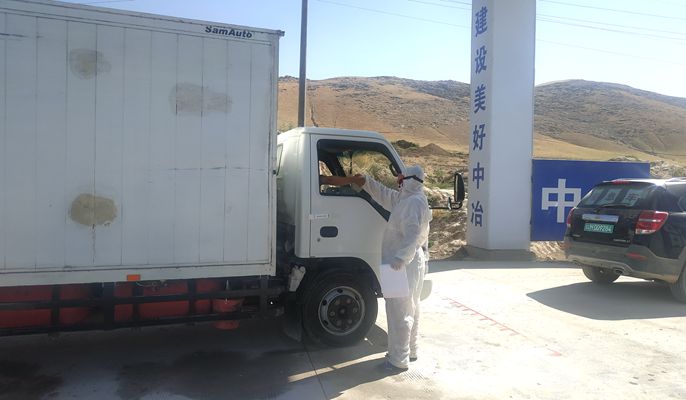 根据乌国疫情发布信息,由哈萨克斯坦进入乌兹别克斯坦的大货车司机出现多例确诊,而大货车是必须进入施工现场的,如何把大货车司机可能带入疫情进现场的风险降到最低是一个防控关键点。为此,项目部重新作出部署,在进入现场的主大门入口,原来作为施工人员进入现场的实名制通道,也是入场车辆的唯一入口。为了阻断外来大货车司机与施工人员接触的可能性,项目部封锁了大门处的实名制通道,从生活区后方重新设置一处人员通道,现场大门处仅供车辆通行使用,实现人车分流。入场的大货车需经过两道关,第一道是在厂区外接受初步的消毒和测温检查,第二道即是在项目部入场大门前接受全面的消杀处理和测温复查,并对大货车贴条封闭,严禁司机在场区内下车走动与场内员工接触。期间对大货车进行消杀和检查的人员必须提前穿戴好防护服、护目镜、口罩等防护用品,并于事后进行彻底的消毒处理。