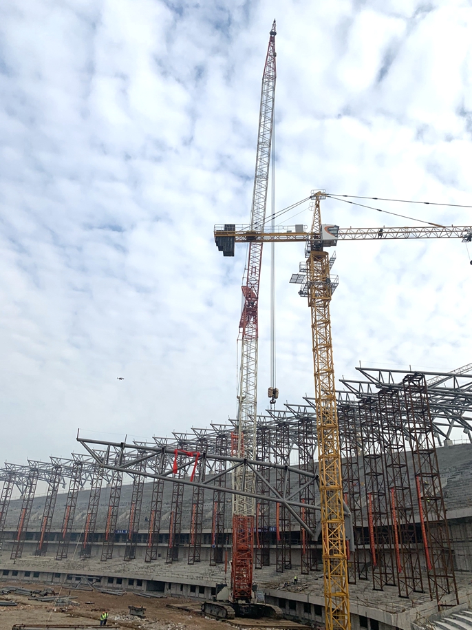 滁州市奥体中心体育场建筑面积为69988平方米,建筑高度为46.1米,观众坐席39222座。由四部分组成,分别是东、南、西看台以及北酒店。体育场钢结构屋盖主要由55榀径三角空间主桁架+8榀平面次桁架+环桁架+封边桁架+拉索+立面钢结构组成,最大吊装半径42米,桁架最重60吨,采用整段吊装,难度巨大。为确保此次吊装顺利完成,十七冶项目部合理编制吊装方案,严格规范吊装程序,积极调配人、材、机等生产物资,以专业的技术力量和过硬的技术水平,顺利完成体育场主桁架吊装,实现了钢结构封顶。