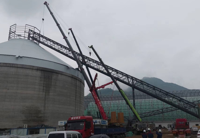 熟料输送通廊全长112米,重量160t,属连续钢桁架形式,施工时分三段安装,其中第三段长度39米,重55吨,斜跨在熟料库标高52米的库顶中心平台和库壁上标高36米的第二段通廊门架之间,是房屋公司历年来施工的海螺水泥生产线中跨度最大、重量最大、安装难度最大的熟料输送通廊。承担此次生产线钢结构制安任务的结构安装处施工人员根据现场情况认真编制吊装安全专项施工安案,精心组织施工、周密部署,选定符合安全吊装性能的起重机械,在项目部相关部门的密切配合下,克服不利天气造成的影响,用650t和300t汽车起重机采取双机抬吊形式顺利完成了第三段通廊的吊装。