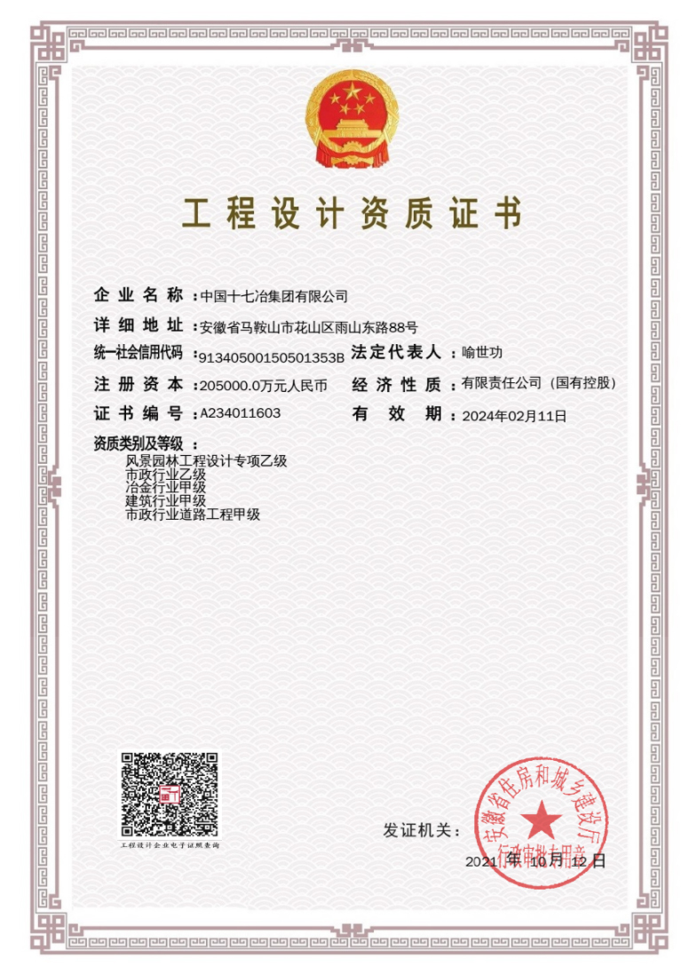 10月13日,中国十七冶集团获得安徽省住建厅颁发的风景园林工程设计专项乙级资质证书。