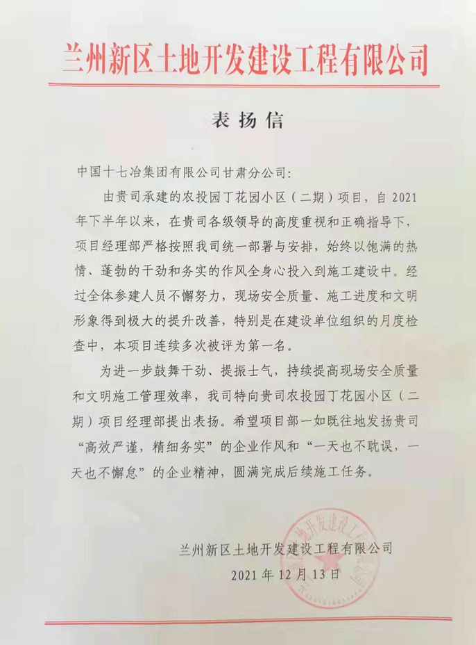 12月24日,兰州新区土地开发建设工程有限公司向中国十七冶集团有限公司甘肃分公司致表扬信,对甘肃分公司承建的农投园丁花园小区(二期)项目现场安全质量、施工进度和现场文明等各方面取得的成绩提出表扬。