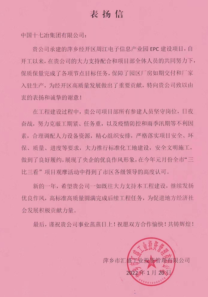 近日,萍乡市汇盛工业投资管理有限公司向中国十七冶集团送来表扬信,对管廊工程技术分公司萍乡周江电子信息产业园EPC建设工程项目团队认真落实安全文明施工,顺利完成节点目标任务,保障园区厂房如期交付投产提出表扬和感谢。