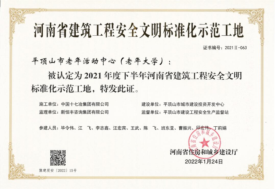 日前,河南省住房和城乡建设厅公布了全省安全文明标准化示范工地名单,由中国十七冶集团承建的平顶山市老年活动中心工程被评为“河南省建筑工程安全文明标准化示范工地”。