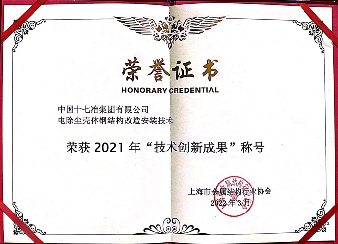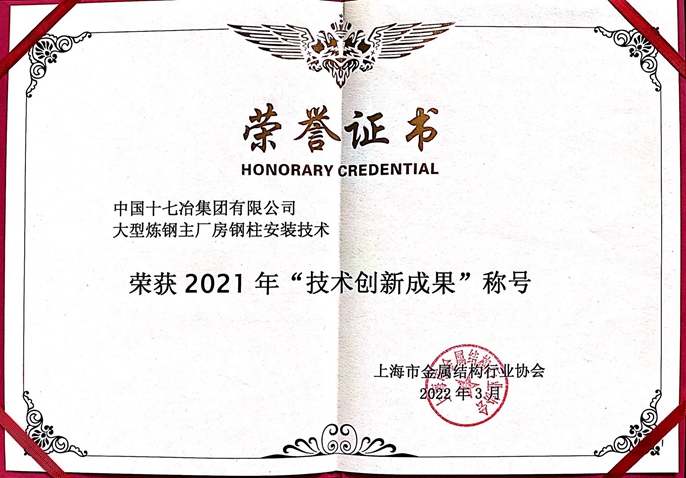 7月17日,中国十七冶集团收到上海市金属结构行业协会颁发的2021年度“技术创新成果”荣誉证书。由中国十七冶集团申报的《大型炼钢主厂房钢柱安装技术》和《电除尘器壳体钢结构改造安装技术》两项成果获此荣誉。公司员工房政、郑治飞荣获“优秀技术人员”称号。