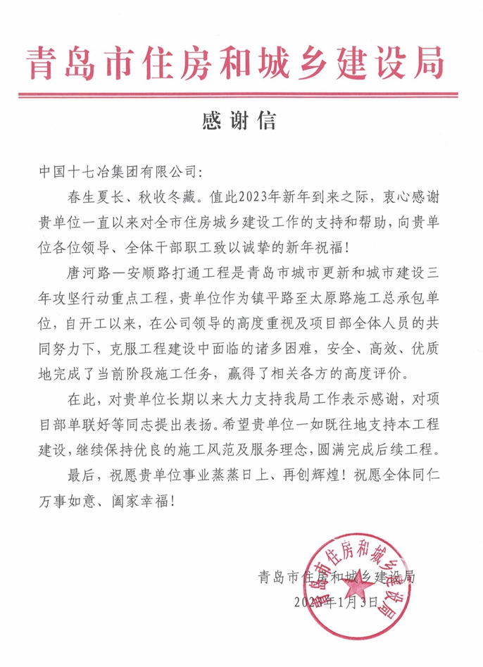 感谢信中指出,自唐河路-安顺路打通工程开工以来,在十七冶公司领导的高度支持和项目部全体人员的共同努力下,克服工程建设中面临的诸多困难,安全、高效、优质地完成当前阶段施工任务,为青岛市城市更新和“城市建设三年攻坚行动”的顺利进行作出积极贡献,赢得了相关各方的高度评价。